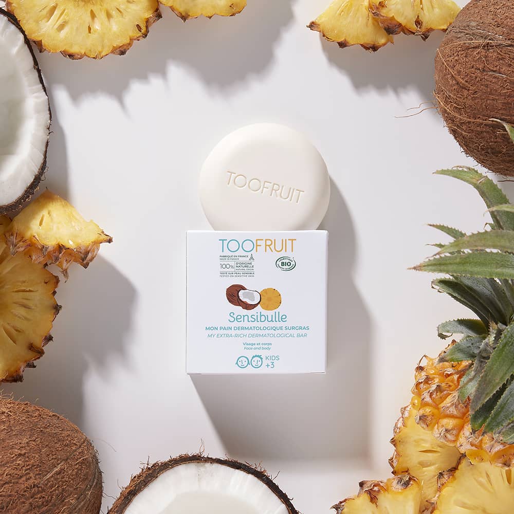 Erityisesti lapsille suunniteltu, sertifioitu luonnonkosmetiikan saippuaton ja sulfaatiton puhdistuspala. Puhdistaa herkän ihon kuivattamatta, ei tee ihosta kiristävää. Sheavoita, manteli- ja kookosöljyä sisältävä kiinteä pesupala ravitsee ja pehmentää ihoa. Tuotteella on lasten iholle ihanteellinen pH ja se soveltuu käytettäväksi sekä kasvojen että vartalon iholla. Tuoksuna trooppisen herkullinen ananas-kookos.